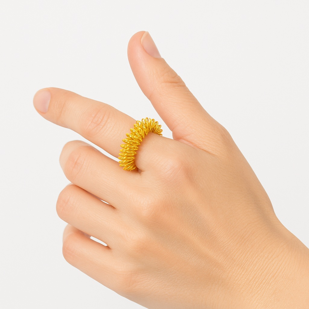 Vďaka pružnej kovovej konštrukcii so zlatým (Yang) povrchom vytvára prsteň príjemný, jemne stimulačný tlak – podobný akupresúre. Je ideálny na krátke „mikroprestávky“ počas dňa, pri práci na počítači, s mobilom alebo po fyzickej záťaži rúk.