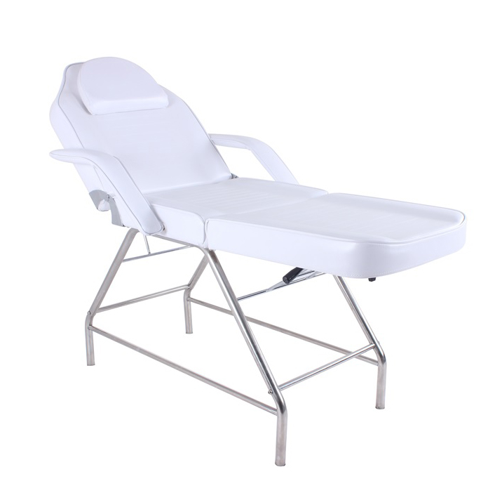 Kozmetické kreslo Basic sa skladá z kovovej konštrukcie a dosky stola, ktorá je rozdelená na tri časti. Opernú časť chrbátu je možné nakloniť nahor s maximálnym uhlom 65º. Nohy je možné polohovať smerom dole s maximálnym uhlom sklonu 70º. Kozmetické kreslo sa pohodlne polohuje pomocou madiel z oboch strán. Uhol sklonu nôh a chrbtu môžete nastaviť podľa potreby vďaka jednoduchému mechanizmu. Kozmetické kreslo je vybavené opierkami na ruky, ktoré sa prispôsobujú uhlu opernej časti chrbta. Na tejto časti sa nachádza tiež otvor na tvár, v prípade potreby otočenia klienta / klientky na brucho. Ku kreslu je dodávaný vankúš na uzatvorenie diery na tvár a pohodlné opretie hlavy. Kreslo má koženku v bielej farbe, ktorá je príjemná na dotyk a odolná voči poškodeniu pri pravidelnom a dlhodobom používaní. Kovová konštrukcia kresla má nosnosť 150 kg.