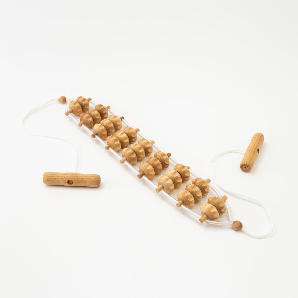 Masážny pás má množstvo malých ozubených diskov, ktoré sú zaoblené a správne zoradené. Vďaka tomu si užijete výbornú automasáž, alebo poskytnete vašim klientom perfektný zážitok s maderoterapeutickej masáže. Drevené rukoväte výborne padnú do ruky a preto je masáž s týmto masážnym pásom jednoduchá.