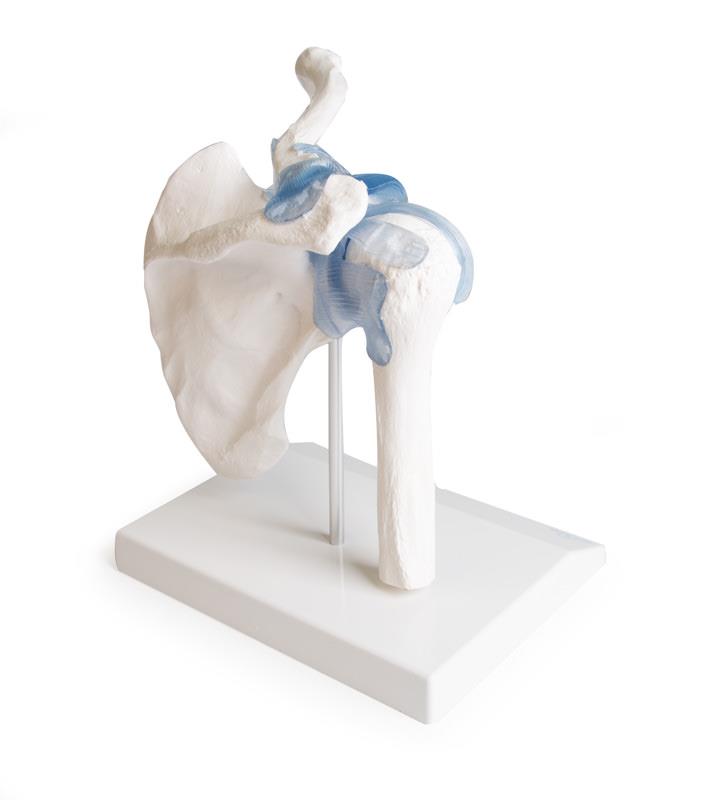 Prirodzený odliatok ľudského ramenného kĺbu. Ramenná časť (lopatka a kľúčna kosť). Okrem úsekov kĺbového púzdra sú zastúpené hlavné väzy, ako sú korakoakromiálne väzivo a priečne väzivo lopatky. Vďaka ohybnosti modelu môžete demonštrované hlavné pohyby ramenného kĺbu, ako je anteverzia, retroverzia, vonkajšia a vnútorná rotácia a abdukcia. Súčasťou ramenného kĺbu je stojan, tento stojan je odnímatelný, aby bola zabezpečená jednoduchá demonštrácia pohybov kĺbu.